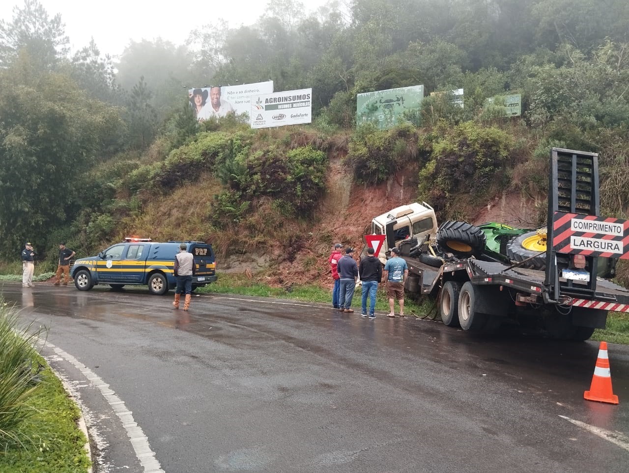 O veículo, carregado com um trator, ficou imobilizado fora da pista. Não houve bloqueio da pista.
