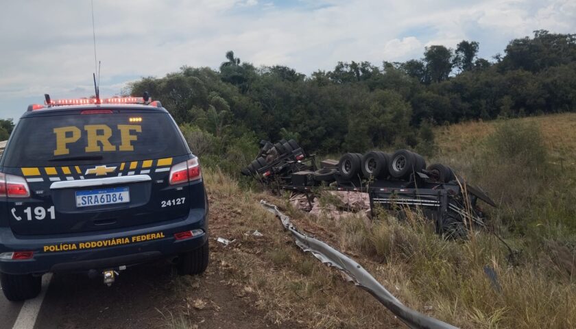 Na tarde desta quarta-feira (12), por volta das 13h40, a Polícia Rodoviária Federal atendeu um acidente do tipo saída do leito carroçável envolvendo um caminhão Scania/G 420 o qual tracionava um semirreboque Noma. O sinistro ocorreu no km 337 da BR-287 em São Vicente do Sul.