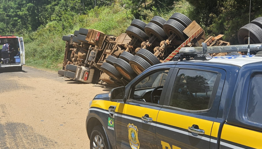 Na tarde deste domingo (05), por volta das 12h30min, a Polícia Rodoviária Federal atendeu um acidente do tipo saída de pista seguido de tombamento envolvendo um caminhão trator atrelado a dois semirreboques. O acidente ocorreu no km 350 da BR-287 em Jaguari. O motorista, um homem de 44 anos, não se feriu.