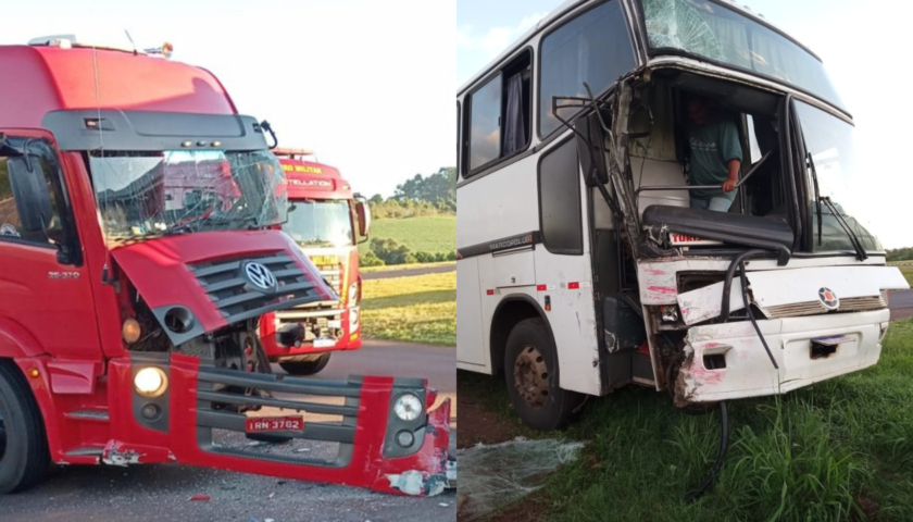 Os dois veículos colidiram quando, segundo a Polícia Rodoviária Federal (PRF), o caminhão tentou acessar a rodovia e acabou se chocando com o ônibus, que já estava na via.