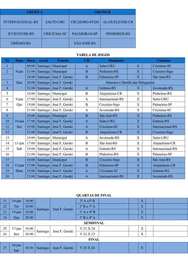 Depois de quatro temporadas ausente do calendário do futebol juvenil, a Copa Santiago será retomada em janeiro de 2025, com a participação de 10 equipes. Na 33ª edição, que será disputada entre os dias 8 e 18 de janeiro, os participantes serão divididos em dois grupos, com 5 clubes cada, e jogos dentro do grupo. Os quatro primeiros avançam para a disputa das quartas de final.