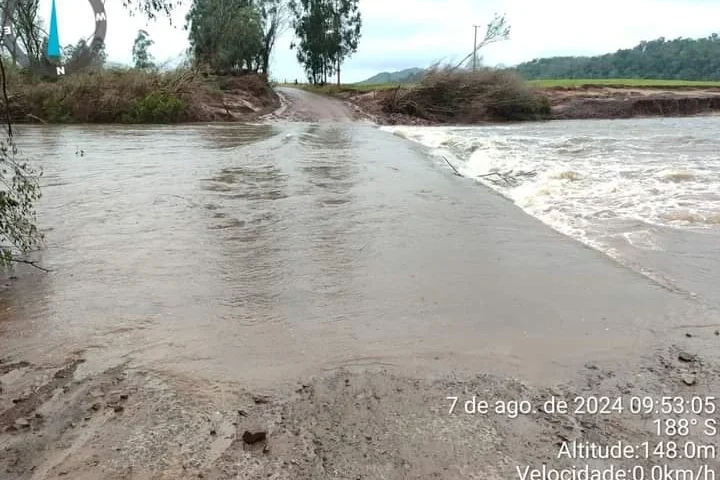 A Defesa Civil de Santiago informa que devido a chuva passar dos 100 (mm) entre domingo e quarta-feira (7) a ponte do Passo da Cruz não está dando passagem.