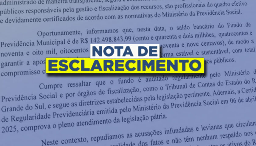 Na nota, esclarecem que o Fundo de Previdência dispõe de um saldo bancário positivo de R$ 142.498.843,99 (cento e quarenta e dois milhões, quatrocentos e noventa e oito mil, oitocentos e quarenta e três reais e noventa e nove centavos), e esclarecem que o Município não tem qualquer dívida pendente com o Fundo de Previdência.