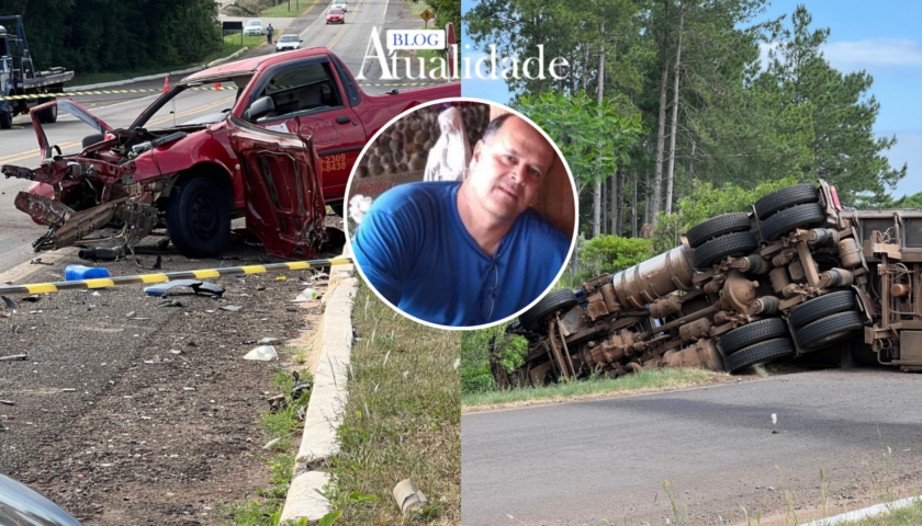Informações preliminares de que o motorista de uma Ford Courier, de 57 anos, morador de Santiago, entrou em óbito após acidente envolvendo também um Clio e um bitrem. Ele foi identificado como João Carlos Flores e Silva.
