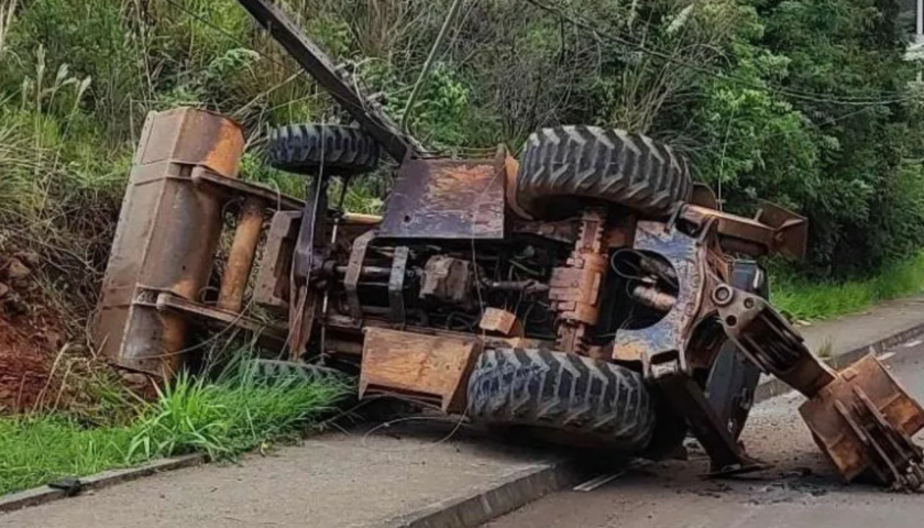 O trator parou lateralizado, entre a rua e a calçada, depois de atingir um poste de energia elétrica. Nenhum outro veículo se envolveu no acidente.