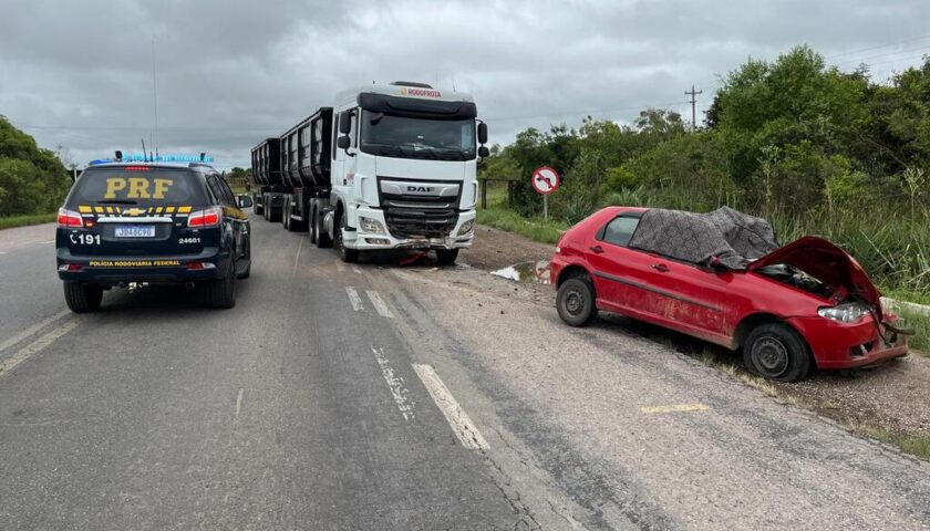 O trânsito no local segue em meia pista, com o sistema pare-e-siga, até a remoção dos veículos envolvidos. A PRF está no local, realizando os procedimentos de apuração e orientando os motoristas.
