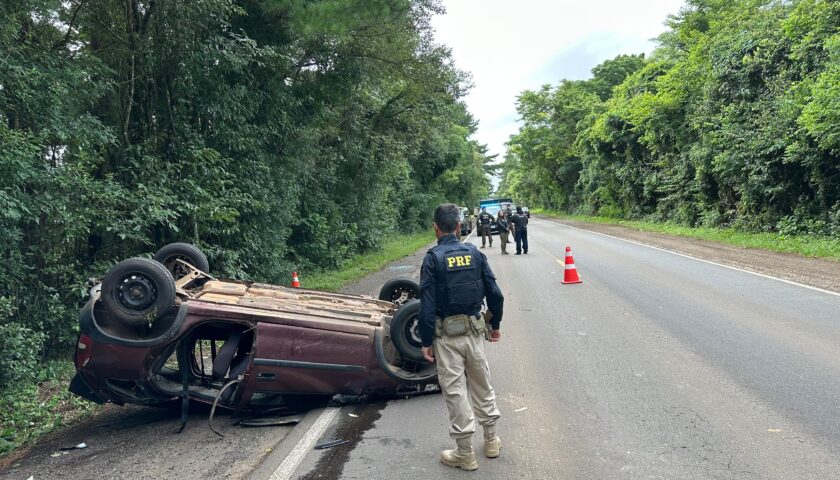 A Polícia Rodoviária Federal atendeu, neste domingo (08), a um capotamento de um carro. Uma pessoa morreu no local e outra teve lesões leves. O sinistro de trânsito aconteceu por volta das 04h40, no km 380 da BR-287, em Santiago.