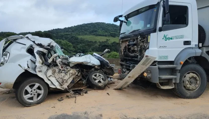 Um motorista morreu em uma colisão frontal com caminhão, na manhã desta segunda-feira, dia 16, na BR-116, em Lages, na Serra catarinense. A vítima, de 61 anos, conduzia uma Renault Duster, com placas de Capão Alto. Ele foi encontrado em óbito e preso nas ferragens do veículo que ficou completamente destruído.
