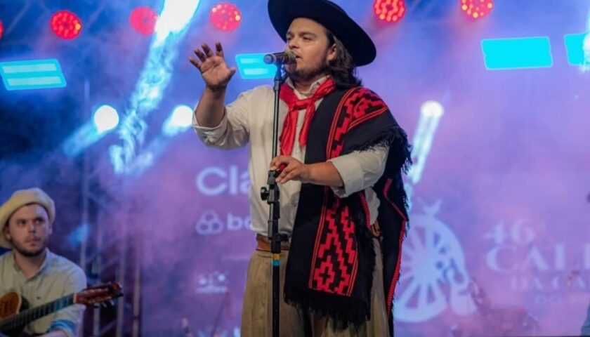 Na final, o santiaguense Matheus Pimentel brilhou ao interpretar a toada “Recolho Versos do Campo”, com letra de Gujo Teixeira e melodia de Cristian Camargo, levando para casa a Calhandra de Ouro, o prêmio mais cobiçado do evento.