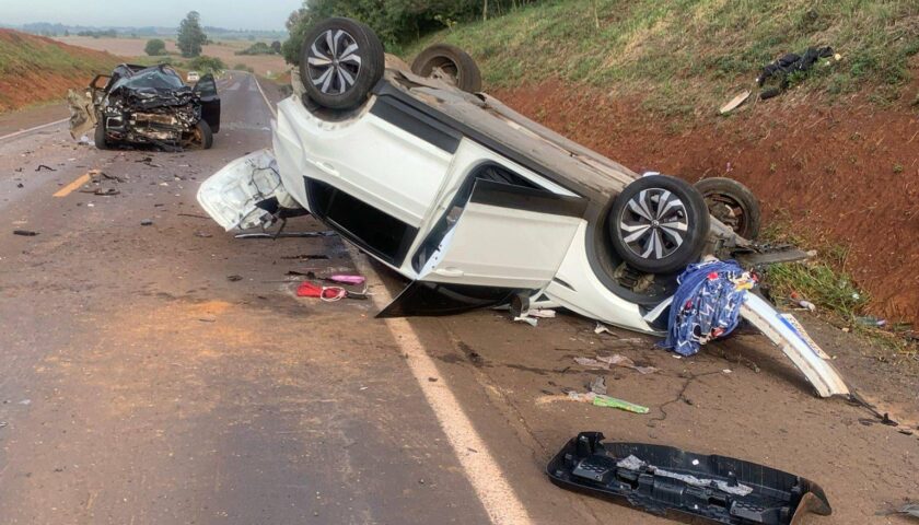 O acidente, do tipo colisão traseira, envolveu três veículos: um caminhão carregado com soja; um Volkswagen T-Cross e um Chevrolet Tracker. Com o impacto, um dos carros capotou.