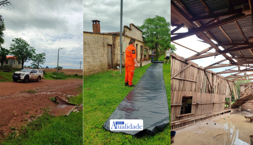 Uma residência atingida por árvore na localidade de Ernesto Alves, onde também houve queda de postes e interdição da ponte de acesso principal devido a fios sobre a estrada — o tráfego está sendo desviado pela estrada da Linha 8;